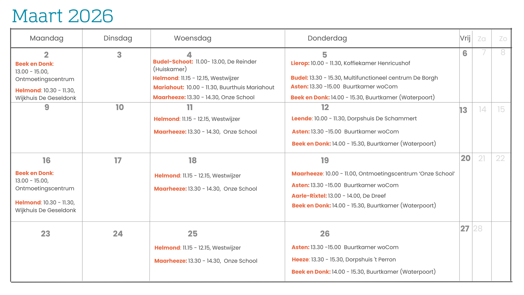- Elke 3e donderdag van de maand van 10.00 tot 11.00 uur, ontmoetingscentrum 'Onze School', Stationsstraat 52 in Maarheeze. In samenwerking met 'De Helpende Hand' en Sociaal makelaar Maarheeze.