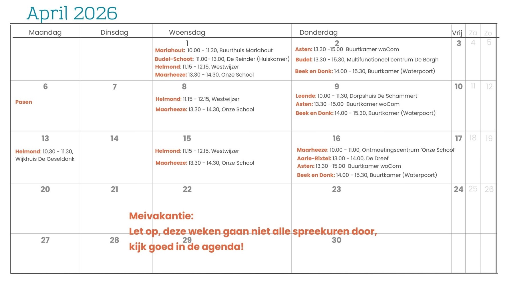 - Elke 2e donderdag van de maand van 10.00 tot 11.30 uur. Spreekurenplein: Dorpshuis De Schammert, Dorpstraat 59 in Leende